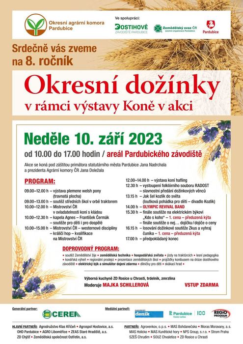 srdečně Vás zveme na 8. ročník Okresních dožínek, které se budou konat v neděli 10. září od 10 do 17 hodin v areálu Pardubického závodiště. Pro návštěvníky je připravený pestrý program a vstup na tuto akci je zdarma. Bližší informace naleznete v přiloženém letáku.